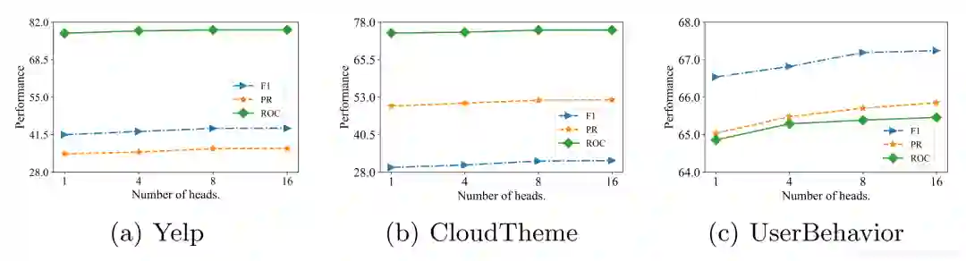 最后,我们调节了潜在偏好的数量,即异质多头注意力机制中的头部的数量。实验结果表明,头部选择8时取得更好的效果。