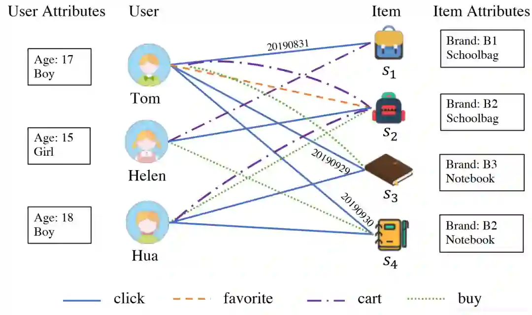 与此同时,另一个问题是,用户和商品之间存在点击、收藏、加入购物车和购买等多种类型的交互行为,蕴含了丰富的结构信息,不同类型的交互行为刻画了用户的多方面偏好和商品的流行度。如图2所示,Hua对于B2品牌的商品更有兴趣,而显然,