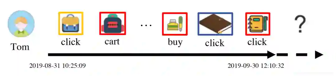 早先的方法从协同过滤角度 (Collaborative Filtering, CF)来建模用户行为,往往忽视了交互行为的动态特性。然而,用户的时序行为往往表示了兴趣的持续演化,如图1所示,Tom当前的需求是笔记本,而在不考虑行为的时序特征时会被误认为是书包。近年来,循环神经网络(Recurrent Neural Networks, RNN),如LSTM和GRU等,被广泛用于建模序列行为的演化。然而,RNN模型在建模长序列时往往存在梯度消失、计算代价昂贵等短板、往往只能建模近期的需求、而难以归纳历史行为习惯。此外,用户的历史习惯往往对于当前的行为具有潜在的影响,购买决策不仅取决于当前需求,也受到用户对于品牌、颜色、设计风格等多方面的历史偏好的影响。