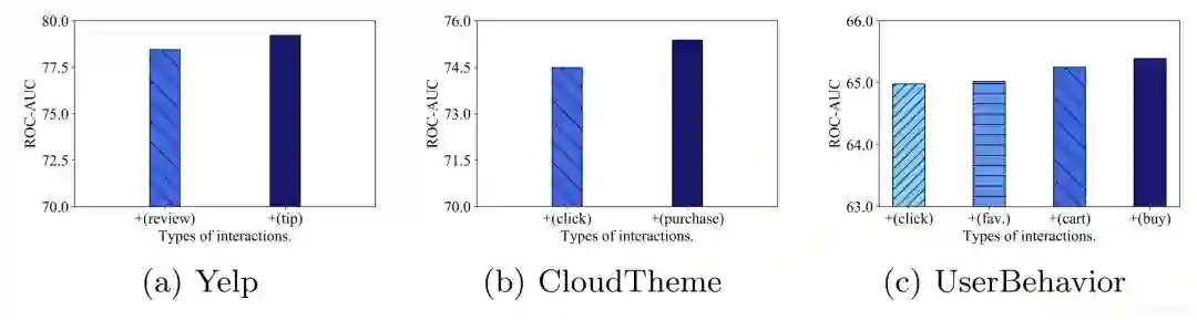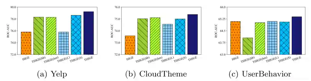 在不断增加不同类型的交互行为,从图9中可以发现模型的提升是持续的,即THIGE充分利用了异质结构信息。此外,从图9(c)可以发现,加入收藏和加入购物车相对于只考虑点击的提升具有显著不同,反映了不同交互行为之间的潜在相关特征是不同的,建模这种相关性是必要的。