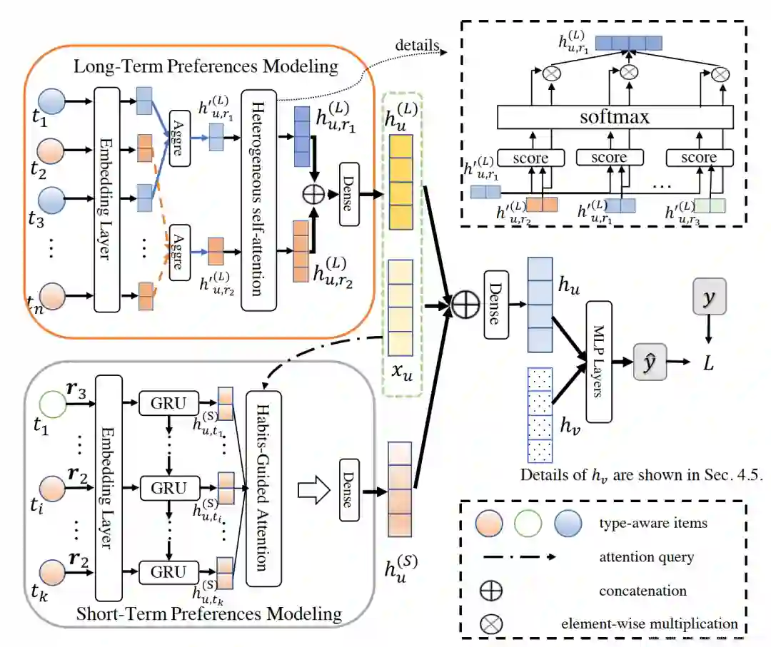 基于异质交互的长期兴趣建模:考虑到用户和商品之间存在多种交互行为,这些不同行为刻画了多种潜在偏好以及偏好之间的潜在关联,我们的目标是充分编码多方面长期偏好的潜在相关性。给定用户的长期交互行为,我们通过异质聚合器来针对不同类型的交互行为分别建模节点表示,即: