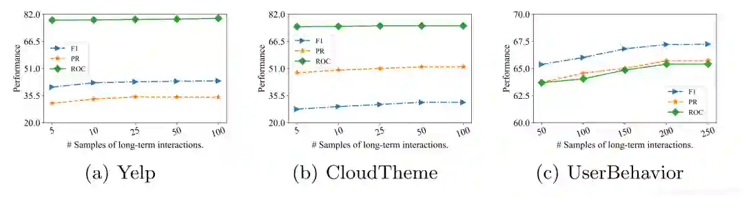 合适的长期行为的采样数量提升了模型的效果,而当采样数量更大时,模型效果不再提升,在Yelp中甚至出现下降的现象。简单地增加长期采样节点的数量并不能持续增加效果,Yelp数据中,一些具有非常多交互行为的用户是异常的,引入了更多的噪声。