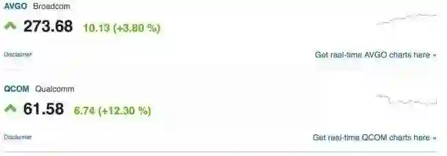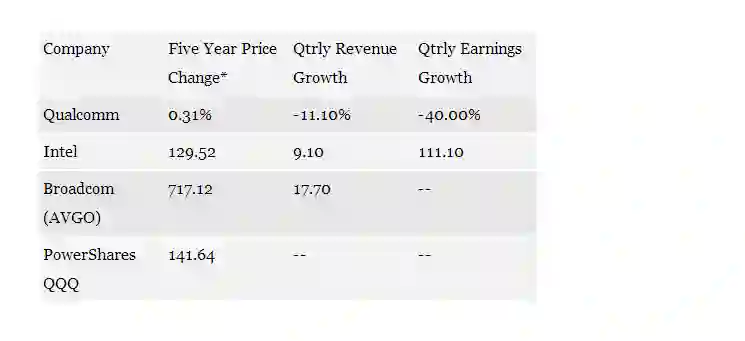 过去5年,高通、英特尔、博通等公司股价、营收增长以及盈利增长数据