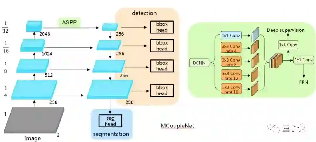 整个网络包含了5个模块:基础网络、ASPP、特征金字塔、检测分支以及分割分支。基础网络部分是团队自主设计的轻量级网络Inception-56,基础网络和特征金字塔之间通过ASPP模块连接在一起,ASPP模块由一系列采用不同膨胀系数的卷积层组合,可以同时捕捉多种上下文信息,并加入深层监督来引导整个学习过程。