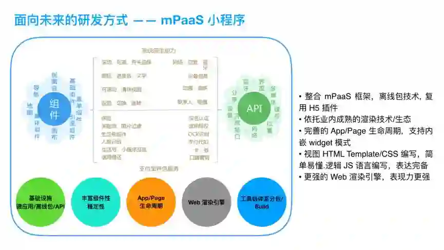 新版的mPaaS还提供mPaaS小程序功能,mPaaS小程序源于支付宝小程序,是支付宝小程序技术的全面开放,包含了小程序开发框架、IDE、发布服务、分析服务等完整能力闭环,让客户可以以小程序的方式开放业务接口,围绕自己的App构建小程序生态。同时,基于mPaaS小程序开发的业务可以在自有App、阿里系、mPaaS生态间投放、联通、共享,壮大客户自主的业务生态。