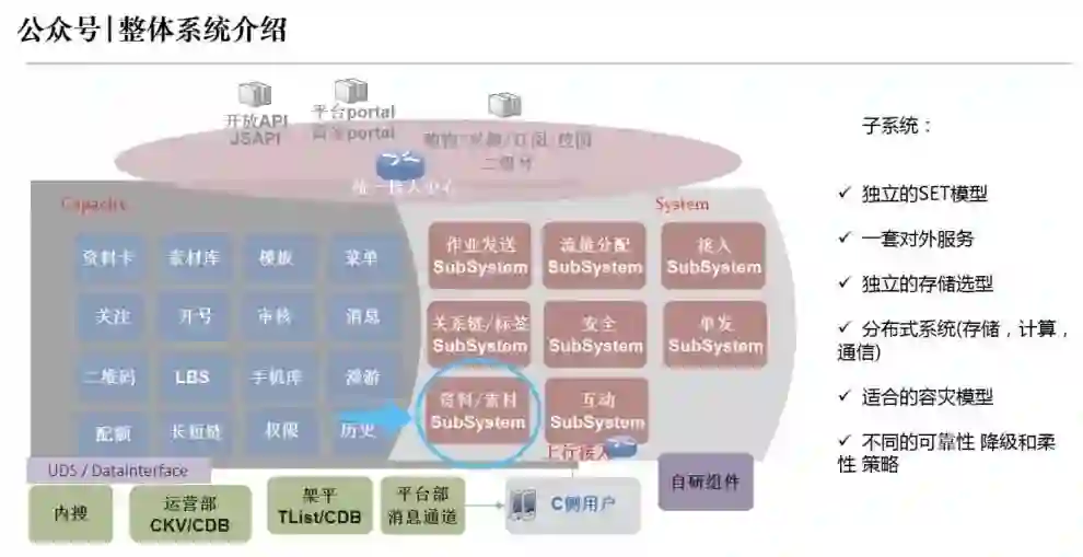 在 15 年的时候,内容平台(承载腾讯包括手 Q 等内容业务等的内容中台)最初来源于 QQ 公众号系统(公众号系统承载了包括 QQ 服务号,订阅号的关注关系,红包等大型活动的推送,订阅号消息下发,素材内容管理等)。当时公众号系统有几个子系统:资料子系统,消息子系统,关系链子系统 和 素材子系统。一个号主如果需要把自己的内容给粉丝,需要经过这 4 个子系统。