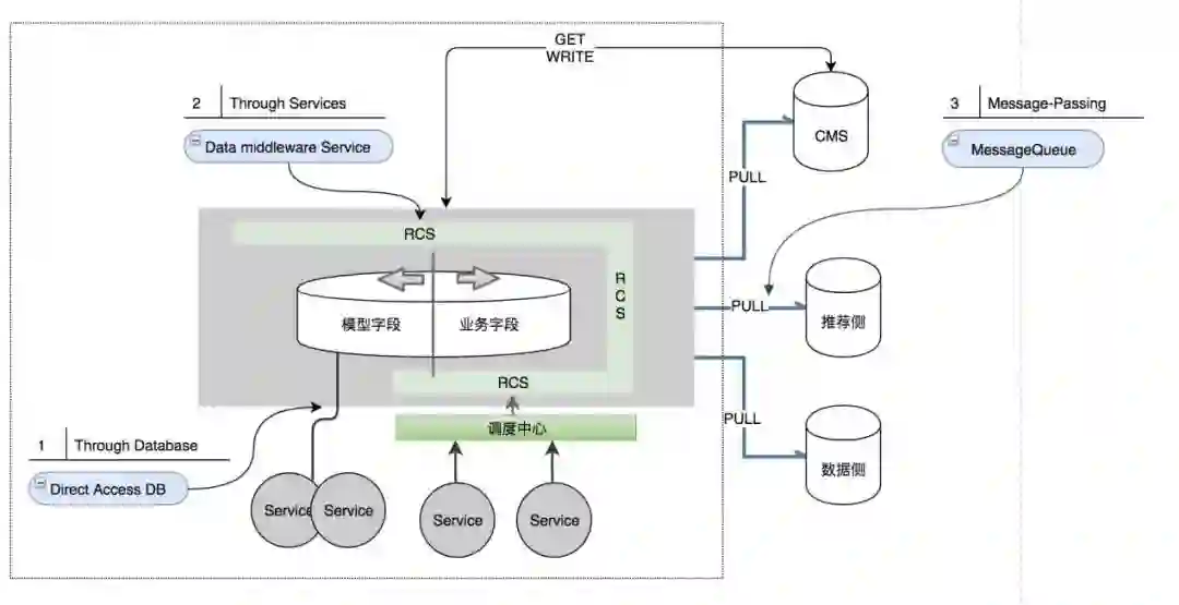在系统与系统之间 (下图虚线框),我们通过 Model_3 的消息队列总线的方式。对外统一通过消息队列总线的方式进行同步,数据包括增量和全量,采用多状态的版本控制,不同的处理状态使用不同的版本号。同时随着业务一致性等场景要求,外部也可以通过我们提供的数据中间件服务 RCS 读写业务数据即 Model_3。