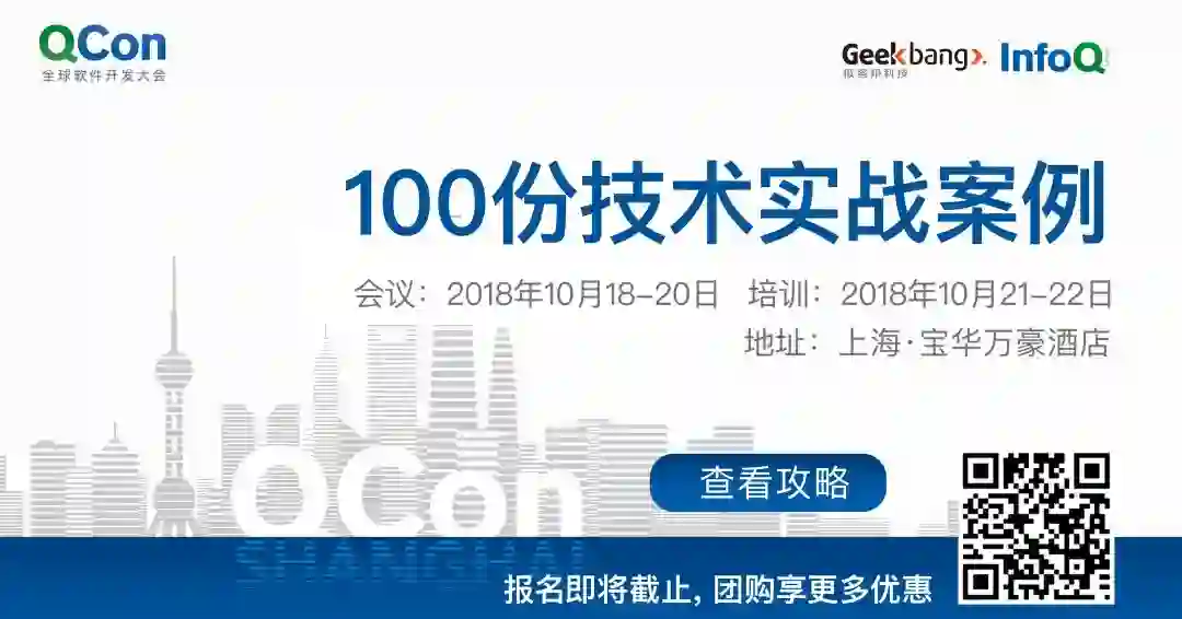 在 QCon 上海 2018,孙子荀会担任《数据与内容中台》的出品人,与腾讯、轻芒的技术大咖分享中台系统的搭建。点击「 阅读原文 」或识别二维码查看大会完整日程。大会报名倒计时中,团购可享受更多优惠。有任何问题欢迎咨询票务经理 Ring,电话:010-84782011,微信:qcon-0410。