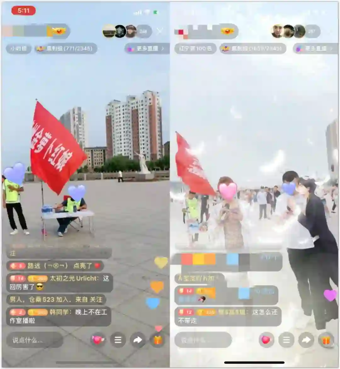 也有线上线下结合的。辽宁葫芦岛某广场,一场户外直播正在进行。道具很简单,一张白色方桌上插一面“相亲”大红旗,5点到8点走,赶趟儿似的,十来个穿着荧光色相亲⻢甲的男女嘉宾就开始轮番上场、自我介绍了。