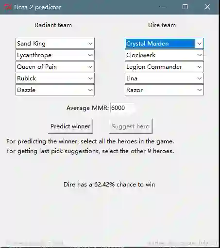 Reddit上面的网友Andrei Apostoae刚刚发布了一个很有意思的机器学习项目(网站地址见文末),叫做Dota2 Predictor。这个项目就是使用机器学习中的神经网络以及逻辑回归方法,通过分析50万场Dota2比赛来帮助大家选择比赛中的最后一个英雄,以及针对对战双方的英雄阵容来预测比赛胜率。这个使用Python编写的程序同时提供了GUI界面,其界面如下: