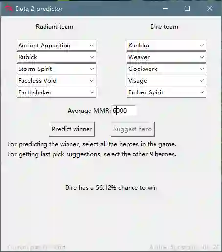 根据程序的预测,夜魇方(Dire)有56.12%的概率获胜——这个胜率并不是非常高,意味着双方的阵容基本势均力敌,夜魇方只是略占优势。