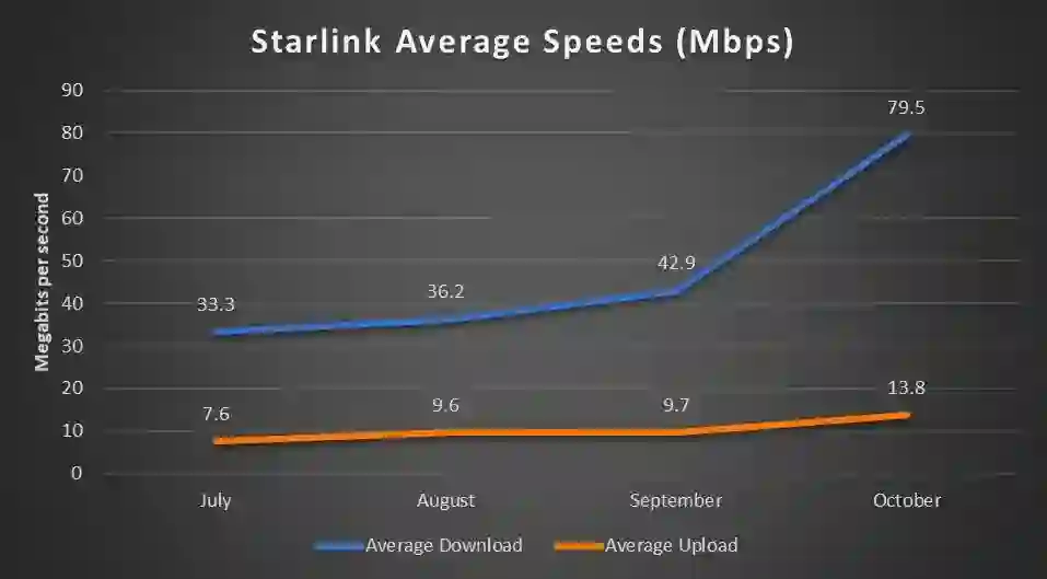 Starlink的速度大大超过了现有的卫星系统。根据数据,2020年10月,HughesNet平均下降19.84Mbps,而VIASA的Exede系统平均下降24.75Mbps。