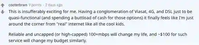 但有位用户也指出,每次中断大约是10秒至15秒,似乎每隔几分钟就会发生一次。但该用户同时指出,有几棵树挡住了信号,但还是有了相对稳定的高速连接。