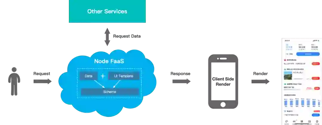 经过方案评估判断,此场景类型属于无状态服务,基于阿里云 Serverless 成熟的生态,高德最终选择接入 Node FaaS(阿里云函数计算)服务能力,出行前端搭建了场景推荐卡片服务。卡片的 UI 模版获取、数据请求聚合&逻辑处理、拼接生成 Schema 的能力均在 FaaS 层得到实现,客户端根据服务下发的 Schema 直接渲染展示,达到更加轻便灵活的目标。