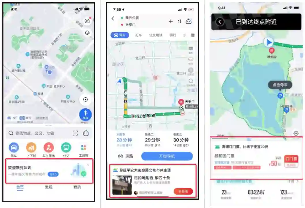 自主出行是高德地图的核心业务,涉及到用户出行相关的功能诉求,承载了高德地图 APP 内最大的用户流量。下图为自主出行核心业务中应用 Node FaaS 的部分场景,从左至右依次为:主图场景页、路线规划页、导航结束页。