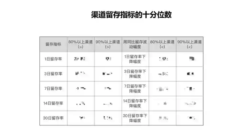 确定指标:留存率指标:1/3/7/14/30日留存率;周同比留存率波动:1/3/7/14/30日留存率较同一渠道上周同一天的下降幅度。