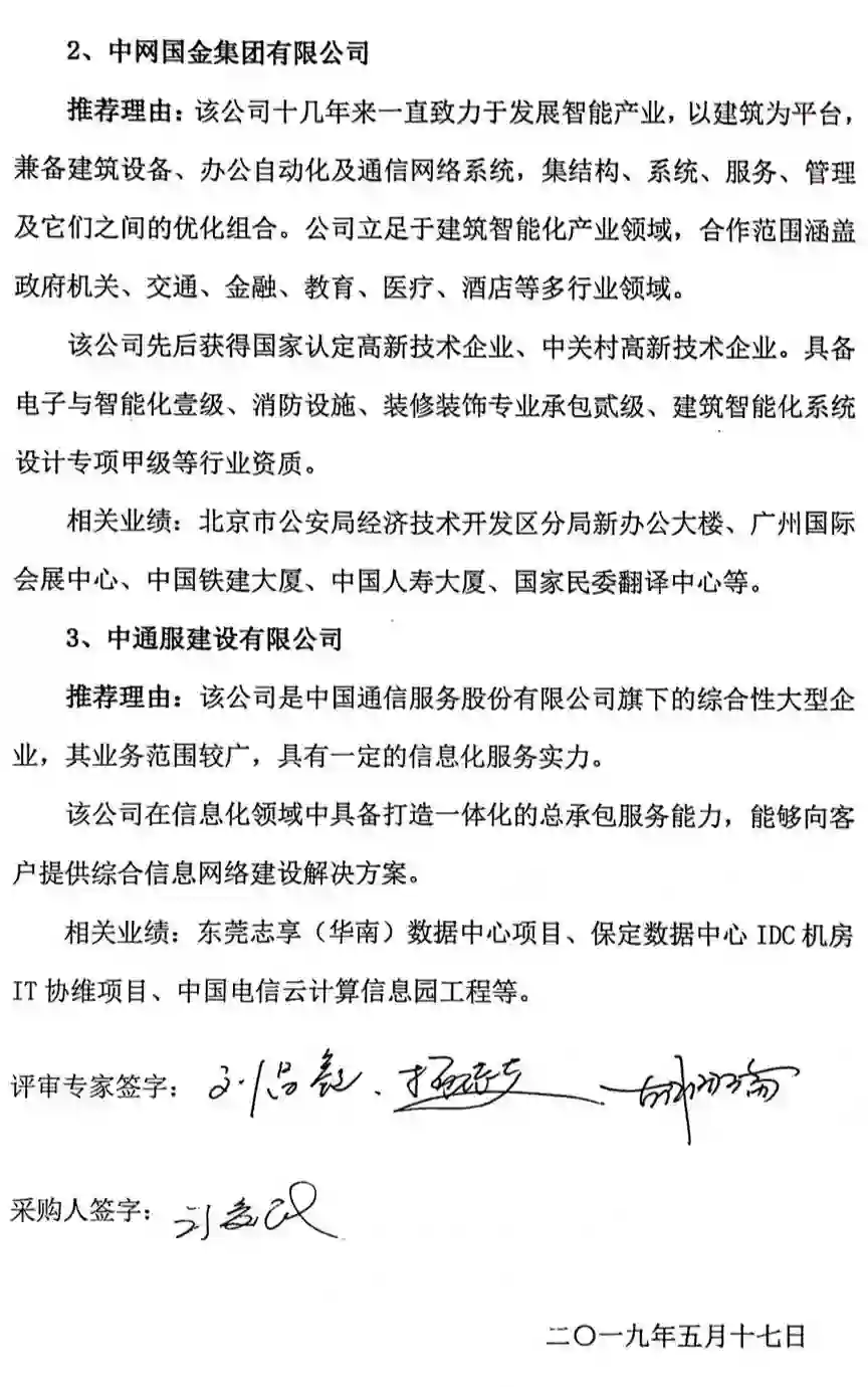 评审专家推荐三家供应商,分别是中华通信、中网国金、中通服: