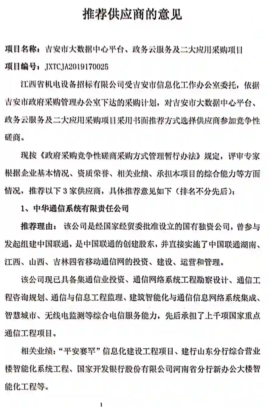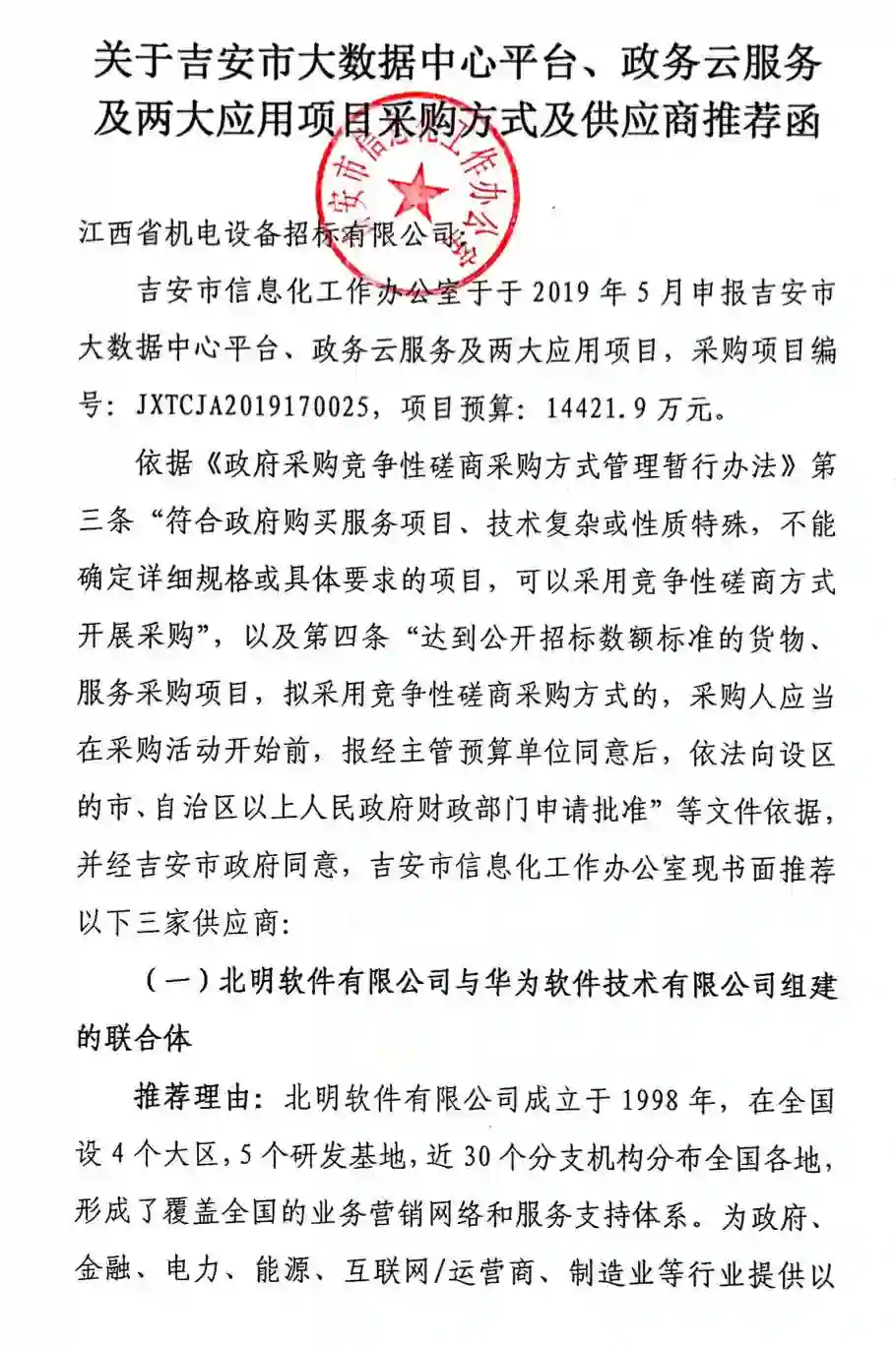 吉安市信息化工作办公室推荐三家供应商,分别是北明软件与华为联合体、浪潮软件与浪潮云联合体、新华三与中广核贝谷科技联合体: