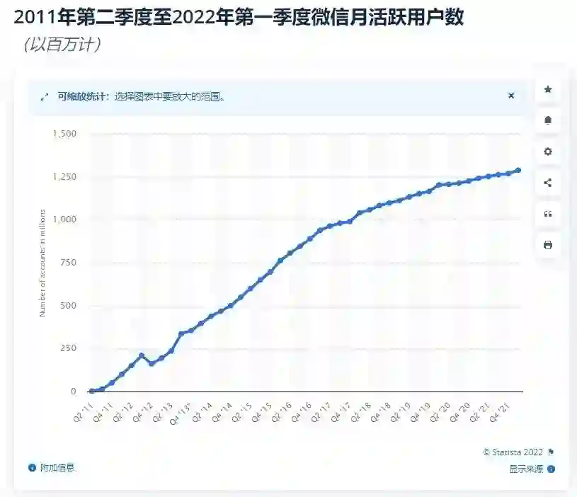 2012 年 3 月,微信用户数突破 1 亿,半年后达到 2 亿;2013 年 1 月,突破 3 亿;2014 年年底,突破 5 亿......