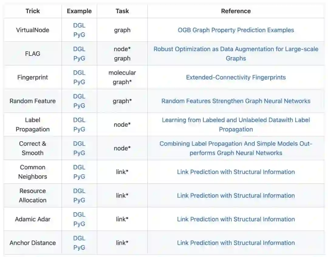 3. 同时支持 DGL 与 PyG。我们对每个 trick 同时提供 DGL 与 PyG 两种实现以及相应的示例。无论您喜欢哪款图深度学习库,都可以尝试使用它。