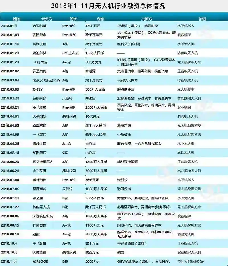 2018年1-11月无人机行业融资总体情况