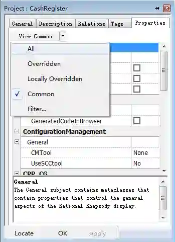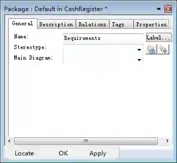 1. 在浏览器展开Packages目录,双击Default包,在属性对话框General页签,将Name框内容改为Requirements,单击OK。