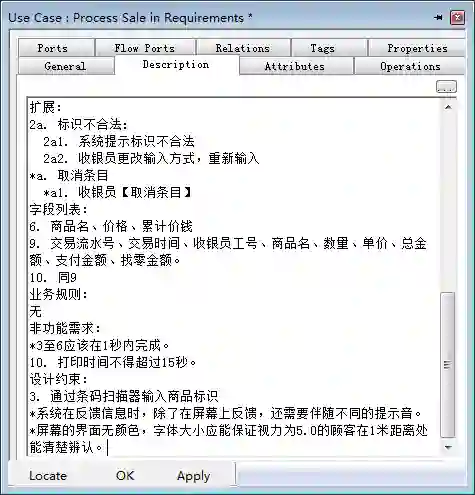 1. 双击Process Sale用例,在Use Case属性框的Description页签输入(粘贴)以下文字,单击OK。