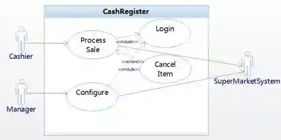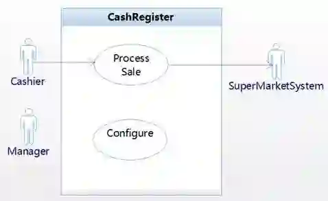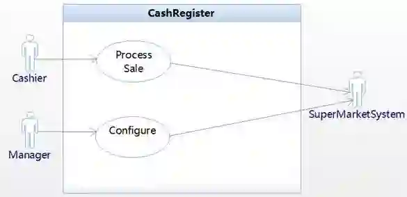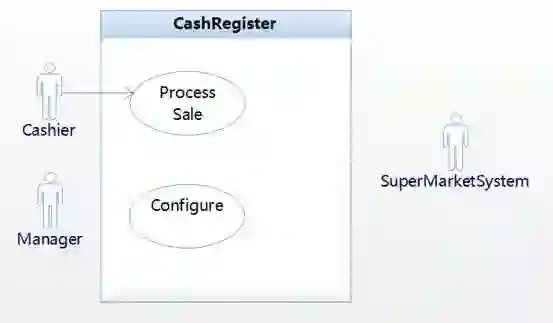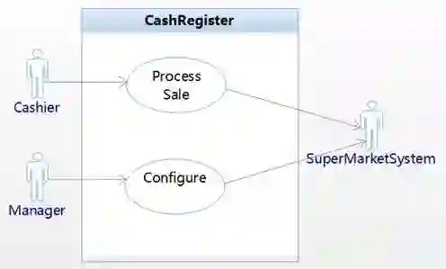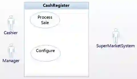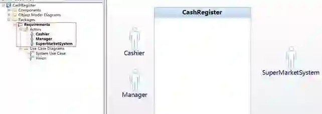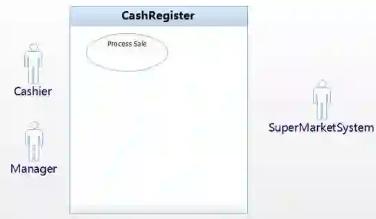 7. 在边界框左侧,Cashier下面添加一个名为Manager的执行者。在边界框右侧,添加一个名为SuperMarketSystem的执行者。