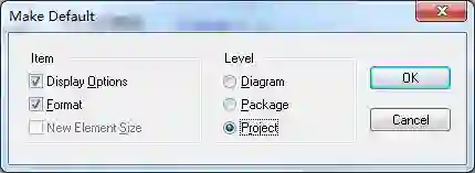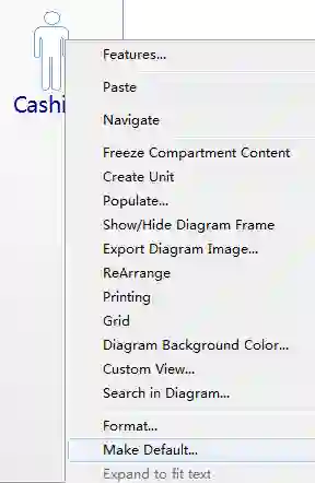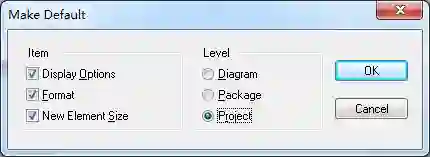 6. 右击Cashier执行者,选择Make Default,在Make Default对话框的Item组选中New Element Size复选框,在Level组选择Project单选钮。单击OK。