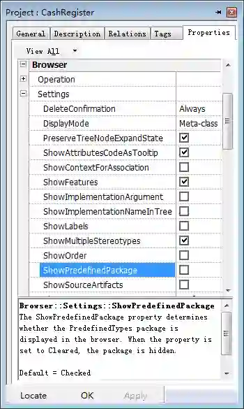 3. 向下滚动,展开Browser-->Settings项目,清空ShowPredefinedPackage的复选框,单击OK。