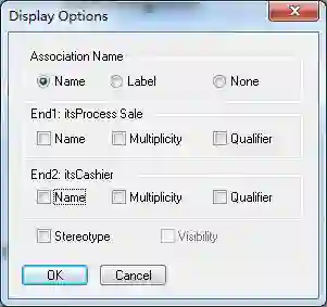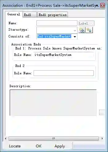 4. 双击关联线,在属性框General页签的Consists of框选择End itsProcess Sale,单击OK。可以看到关联线变成了单向,由Cashier指向Process Sale。