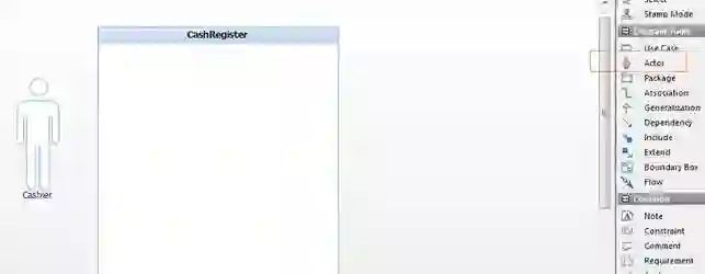 1. 单击工具箱Diagram Tools组下的关联按钮,把光标移到绘图区,当移动到Cashier执行者上时,鼠标指针会变为带圆圈的十字。