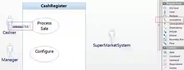 2. 单击Cashier执行者,再单击Process Sale用例,得到一条关联线。