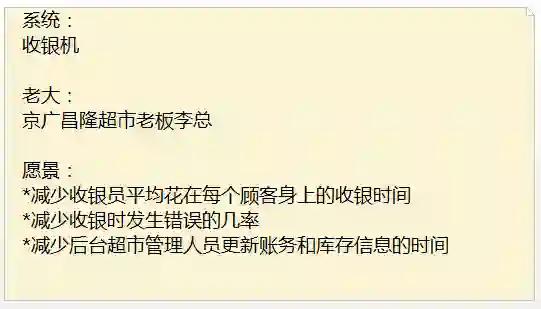 前置条件: 无 后置条件: 系统已经记录收款信息并打印收据 涉众利益: 收银员——担心操作繁琐;担心收错钱,收假钱;担心背黑锅 顾客——希望能在收银过程中能看到收银的明细信息;希望获得收据以便有问题时作为凭据;担心多收钱;担心找回假币;担心等候时间太长 商场管理者--希望减少平均收银周期;担心收银员偷拿钱 基本路径: 收银员【登录】 1 收银员请求开始收银 2 系统显示收银界面 3 收银员提交商品标识和数量 4 系统验证商品标识合法 5 系统记录顾客购买商品,计算累计价钱 6 系统显示购买商品明细,累计价钱 *重复3-6 *收银员可以 取消条目 7 收银员输入顾客付款金额,请求结算 8 系统验证付款金额合法 9 系统计算找零金额,保存收银信息 10 系统显示找零金额,打印收据 11 系统请求超市后台系统接收收银信息 扩展: 2a. 标识不合法: 2a1. 系统提示标识不合法 2a2. 收银员更改输入方式,重新输入 *a. 取消条目 *a1. 收银员【取消条目】 字段列表: 6. 商品名、价格、累计价钱 9. 交易流水号、交易时间、收银员工号、商品名、数量、单价、总金额、支付金额、找零金额。 10. 同9 业务规则: 无 非功能需求: *3至6应该在1秒内完成。 10. 打印时间不得超过15秒。 设计约束: 3. 通过条码扫描器输入商品标识 *系统在反馈信息时,除了在屏幕上反馈,还需要伴随不同的提示音。 *屏幕的界面无颜色,字体大小应能保证视力为5.0的顾客在1米距离处能清楚辨认。 |