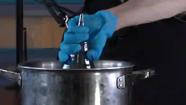 第七步,取一点单晶硅,将其浸入熔化硅(molten silcon)的缸中。