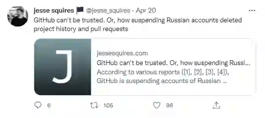 GitHub的做法让Jesse Squires感到很气愤,因为他们只会轻率地暂停俄罗斯贡献者的账户,根本不考虑这一行为带来的破坏性后果。