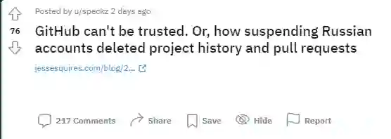他称GitHub并没有做到之前声明中所说的,会为俄罗斯开发者继续提供服务,反而是暂停了自己项目中俄罗斯贡献者的账户,这也导致涉及到的重要项目历史和拉取请求都被删除了。
