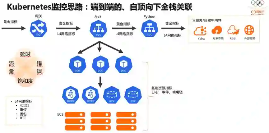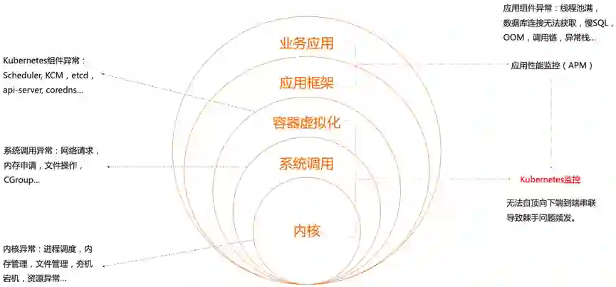 2、自顶向下全栈关联:以 Pod 为媒介,Kubernetes 层面关联 Workload、Service 等对象,基础设施层面可以关联节点、存储设备、网络等,应用层面关联日志、调用链路等。