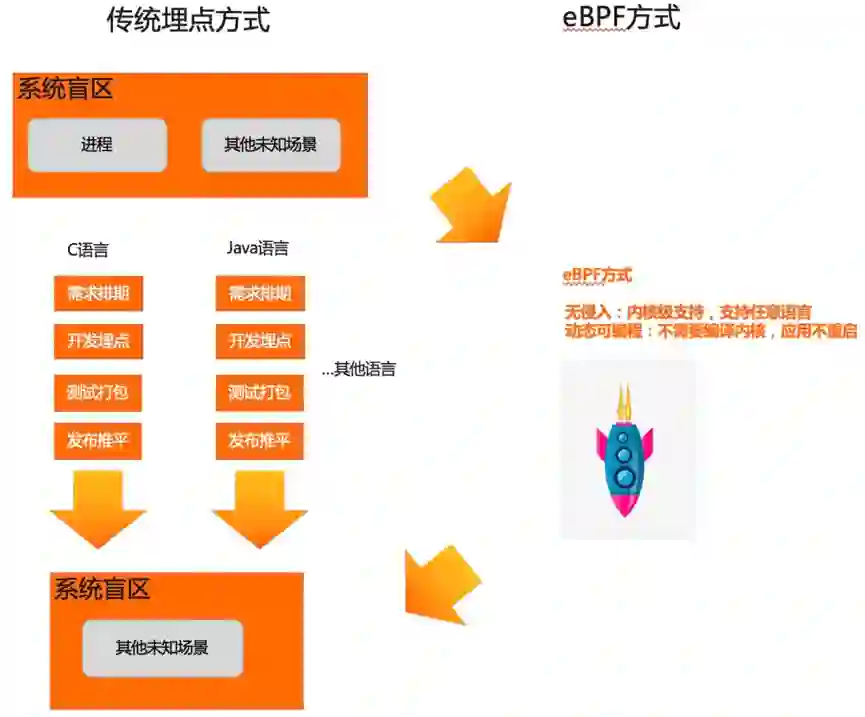 以应用异常为例,当发现应用有异常后,解决问题过程中发现缺少应用层面可观测性,这时候通过埋点、测试、上线补充了应用可观测性,具体的问题得到了解决,但往往治标不治本,下一次别的地方有问题,又需要走同样的流程,另外多语言、多协议让埋点的成本更高。更好的做法是用无侵入方式去解决,以避免需要观测时没有数据。