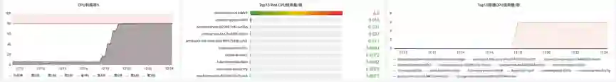 2、查看对应的 CPU 的三元组:使用率、TopN、时序图,首先每个核的使用率都很高,进而导致整体 CPU 使用高;接下来我们自然要知道谁在疯狂地使用 CPU,从 TopN 列表来看有个 Pod 一枝独秀地占用 CPU;最后我们得确认下 CPU 飙高是什么时候开始的。