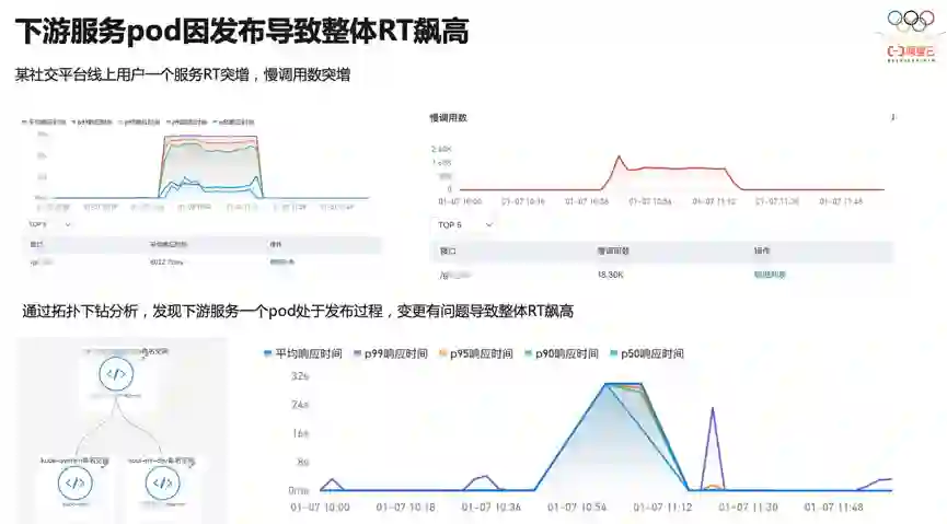 接下来我们看一个典型的案例:下游服务在发布过程中灰度了一个 Pod,该 Pod 因代码原因响应非常慢,导致上游都超时了。之所以能做到 Pod 级别的可观测,是因为我们用 ebpf 的技术来采集 Pod 的流量、黄金指标,因此可以通过拓扑、大盘的方式方便地查看 Pod 与 Pod、Pod 与服务、Pod 与外部的流量。