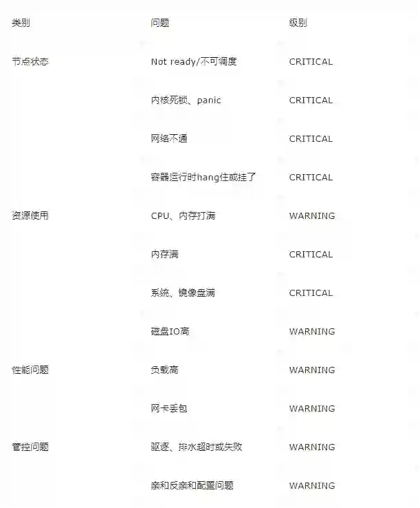 Kubernetes 做了大量工作,尽可能确保提供给工作负载和服务的节点是正常的,节点控制器 7x24 小时地检查节点的状态,发现影响节点正常运行的问题后,将节点置为 NotReady 或不可调度,通过 kubelet 把业务 Pod 从问题节点中驱逐出去。这是 Kubernetes 的第一道防线,第二道防线是云厂商针对节点高频异常场景设计的节点自愈组件,如阿里云的 node repairer:发现问题节点后,执行排水驱逐、置换机器,从而做到自动化地保障业务正常运行。即便如此,节点在长期使用过程中不可避免地会产生各种奇奇怪怪的问题,定位起来比较费时耗力。常见问题分类和级别: