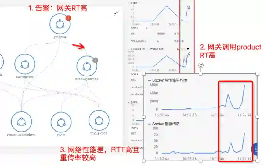 下面的示例展示了因网络问题导致的慢调用问题。从 gateway 来看发生了慢调用,查看拓扑发现调下游 product 的 RT 比较高,但是 product 本身的黄金指标来看 product 本身服务并没有问题,进一步查看两者之间的网络状况,发现 RTT 和重传都比较高,说明网络性能恶化了,导致了整体的网络传输变慢,TCP 重传机制掩盖了这个事实,在应用层面感知不到,日志也没法看出问题所在。这时候网络的黄金指标有助于定界出问题,从而加速了问题的排查。