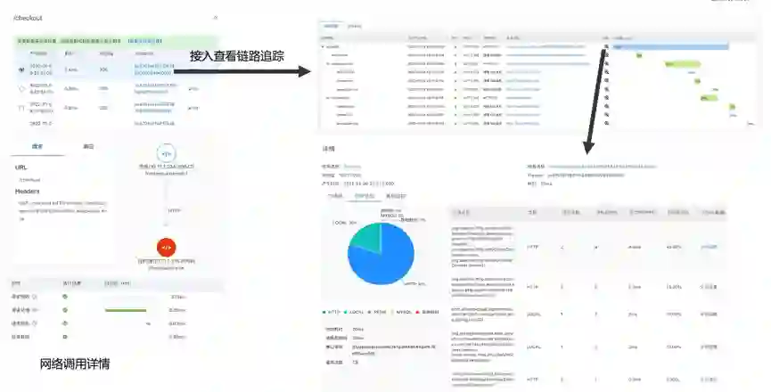 协议 Trace 同样是无入侵、语言无关的。如果请求内容中存在分布式链路 TraceID,能自动识别出来,方便进一步下钻到链路追踪。应用层协议的请求、响应信息有助于对请求内容、返回码进行分析,从而知道具体哪个接口有问题。如需查看代码级别或请求界别的详情,可点击 Trace ID 下钻到链路追踪分析查看。