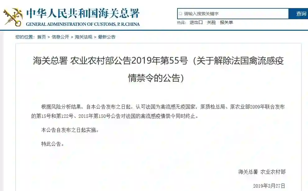 海关总署、农业农村部公告2019年第55号(关于解除法国禽流感疫情禁令的公告)称: