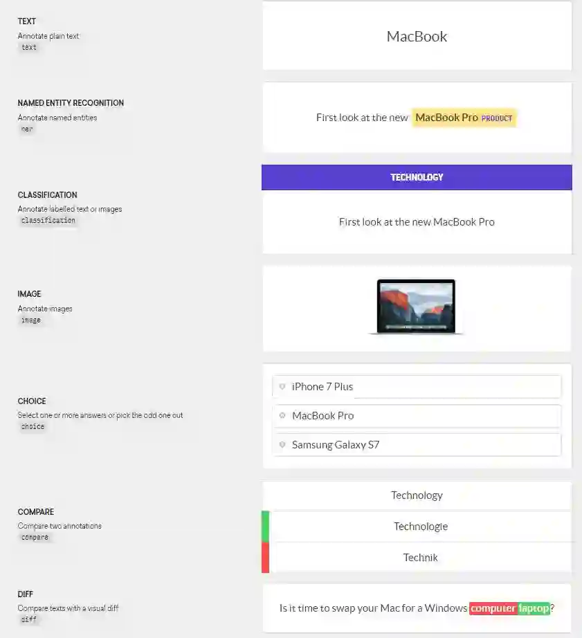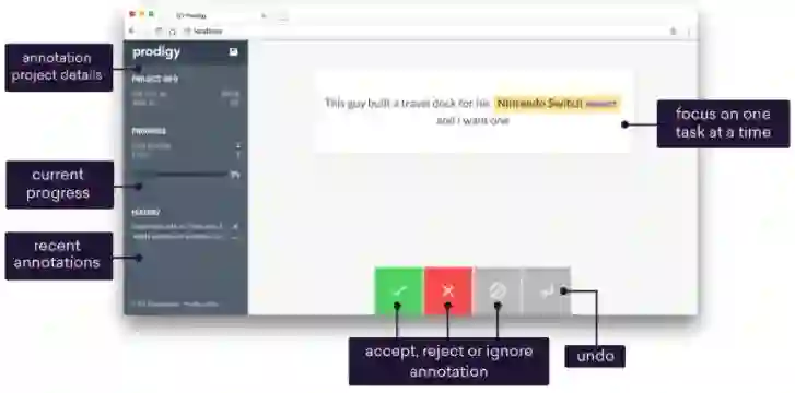 答案是可以的。事实上很多标注工具已经做到了这一点,最先进的如Explosion.ai的Prodigy;然而开发了著名的NLP开源包Spacy的explosion.ai选择了将Prodigy闭源,而Spacy支持中文也仍然遥遥无期。我们希望构建一个开源的中文文本标注工具,而本文很多的技术灵感正是来自Prodigy文档。