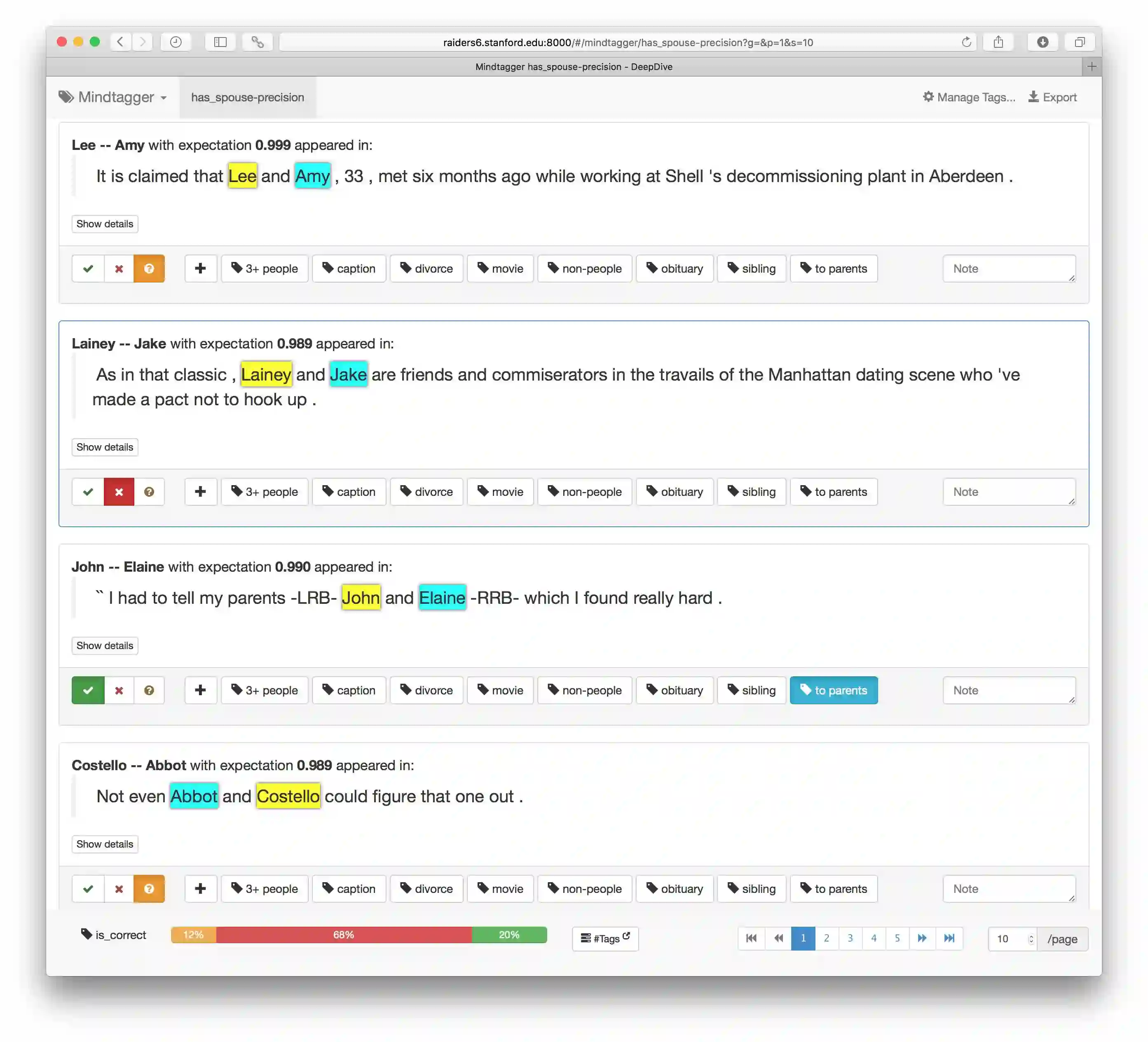 Screenshot of Mindtagger precision task in progress