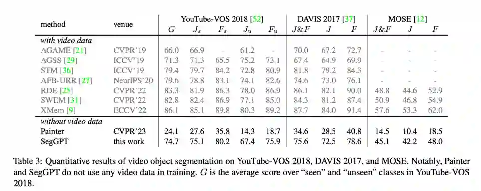 无需视频训练数据,SegGPT 可直接进行视频物体分割,并取得和针对视频物体分割专门优化的模型相当的性能。