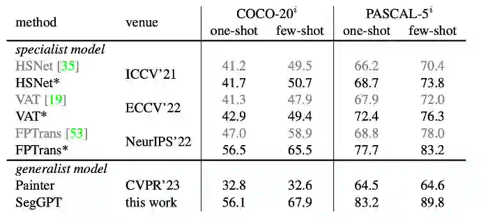 模型只需少数 prompt 示例,在 COCO 和 PASCAL 数据集上取得最优性能。SegGPT 显示出强大的零样本场景迁移能力,比如在少样本语义分割测试集 FSS-1000 上,在无需训练的情况下取得 state-of-the-art 性能。