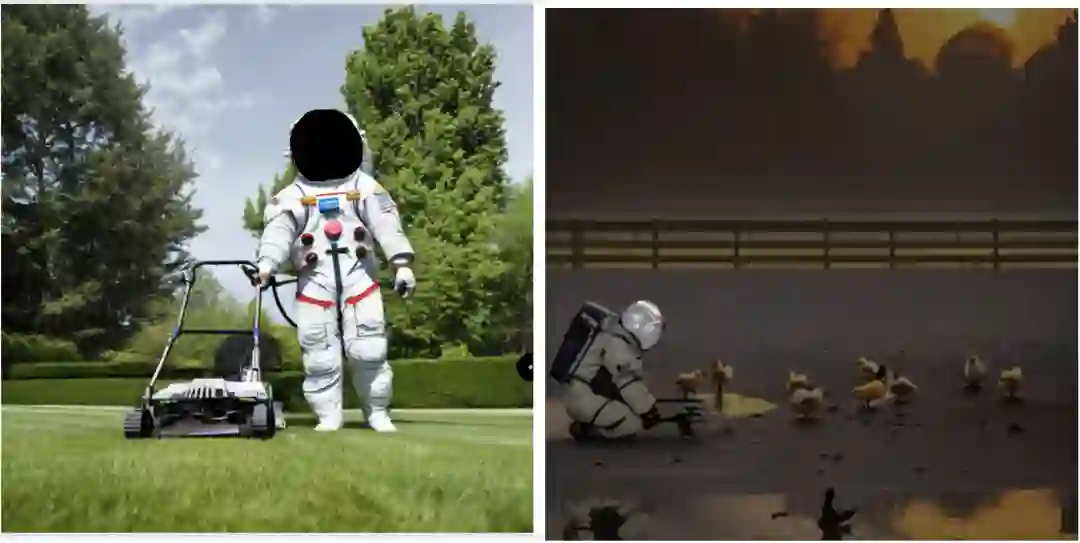 4. SegGPT 能够根据用户提供的宇航员头盔掩码这一上下文(左图),在新的图片中预测出对应的宇航员头盔区域(右图)。